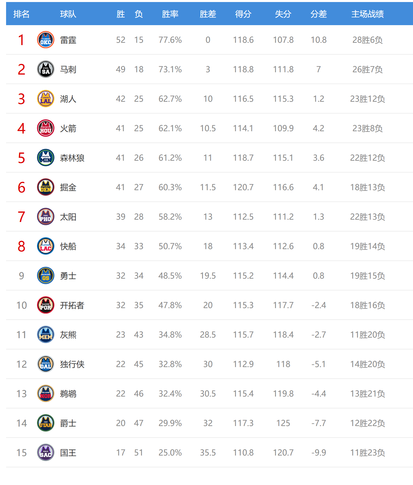 今日比赛后湖人、火箭排名互换,掘金、森林狼排名互换,其他西部球队排名不变。