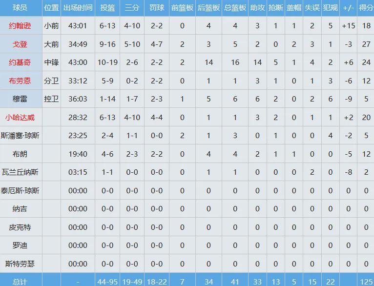 掘金那边“湖人克星”穆雷严重失准投篮14中1只得到5分6板6助,约基奇24分16板14助大号三双外加5断难救主,屡次贡献英雄球的戈登27分5板2助功亏一篑。
